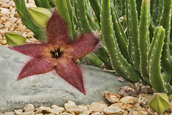 This rare and unusual Star Fish Cactus is found at the Mathai Botanical Gardens, a part of U of M in Ann Arbor. It was in bloom during the latter part of September and beginning of October, 2005. |
